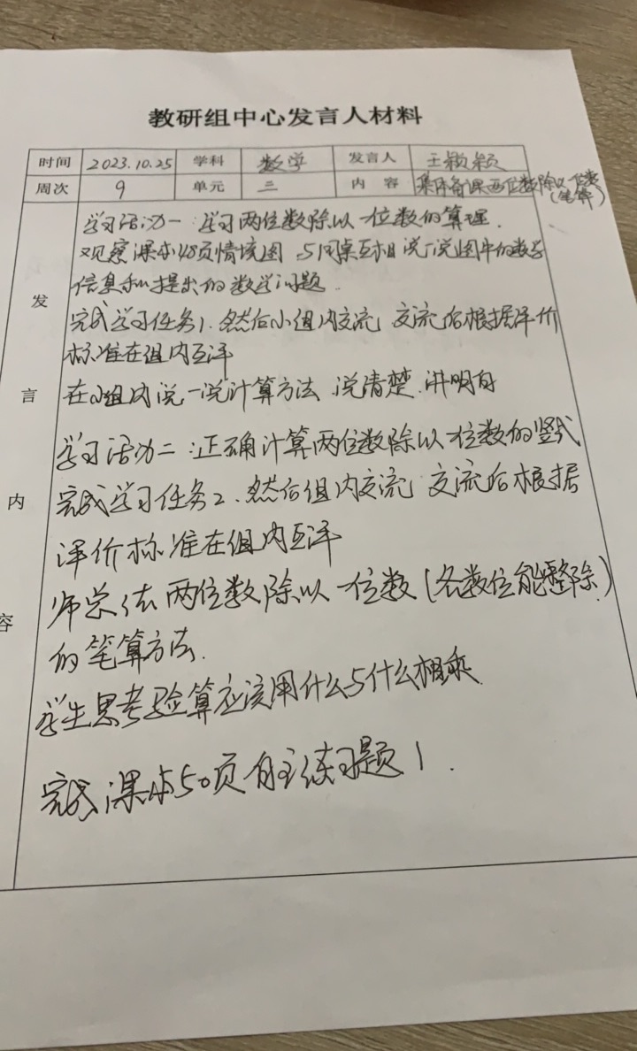 为了更好的促进教学,提升老师们的业务水平,周三下午第三节课全体三年级数学老师在三年级数学办公室进行三年级数学集体教研